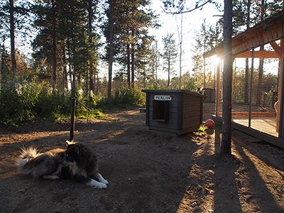 This 4-cage floored and roofed sick-dog facility was built in the summer of 2014 to hopefully reduce the burden on our house during mid-winter (Pasi had had enough of having nearly 20 dogs in the house!). We had already built one such cage on Santa Safari's / Transun UK's farm in the summer of 2012 (since we knew that long-term, their dogs would be more in need and might not have another chance) so, when we finished our contract with them and could justifiably turn our attention back to developments on our own farm, this was one of the top things on our priority list.