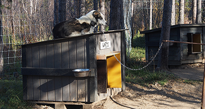 In Alaska, most dogs are kept on individual running chains. However, in Scandinavia, most dogs are kept in shared cages. Having visited a large number of sled-dog farms before setting up our own, we think that there are distinct advantages to both systems. Hence, we use a mixture of the two.