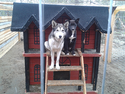 We make a lot of our kennels ourselves from locally sourced materials. All of the kennels in the cages, for instance, are made to our own design and have a double entrance so that there is no chance of one dog denying another access in bad weather. On one side, there is an area that is large enough for two dogs at a squeeze - and dogs tend to sleep together in this side in the winter for added warmth. The other side is an area big enough for one dog and the dogs tend to sleep in the separate sides in the warm summer months.