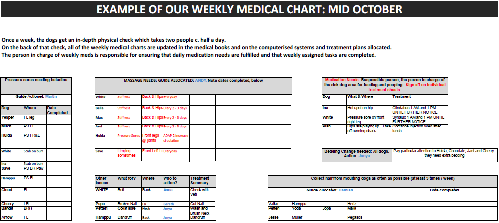 In addition, an individualised dog chart will be written up and posted on the dog kitchen wall. Whenever medications are given, guides have to annotate the chart to ensure that meds are not missed or doubled up. Slightly less big issues are recorded on a weekly medical chart (for instance creaming needs for small pressure sores, checks which need to be made in relation to certain dogs, etc).