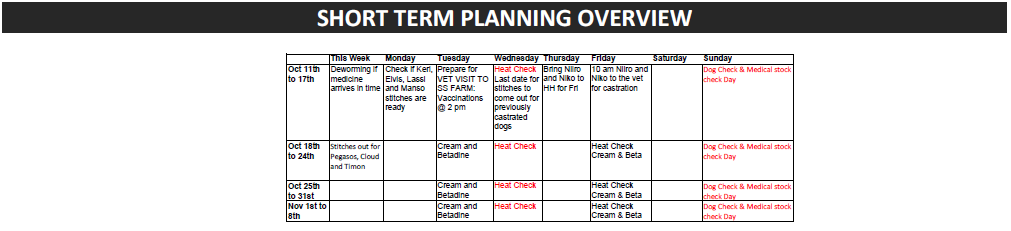 Keeping records is vital. And yet most farms do so in a very marginal way, if at all. Many mushers and folk in the industry have been amazed by the systems we have developed for tracking everything from antibiotic use to calculating automatically, based on the number of dogs we have assigned to the fat or big or small or skinny category during dog check and the portion sizes we have determined appropriate for the time of year to either maintain or increase / decrease the weight as a whole across the kennel, the total amount of food needed, per feeding, in automated systems. On the one hand, we try to be as hands on with the dogs as possible and on the other we try to use scientific tools and formulas to make our behind the scenes work for the dogs as efficient and exact as possible. Click on the chart below for an example of how we keep on top of running dog med schedules...