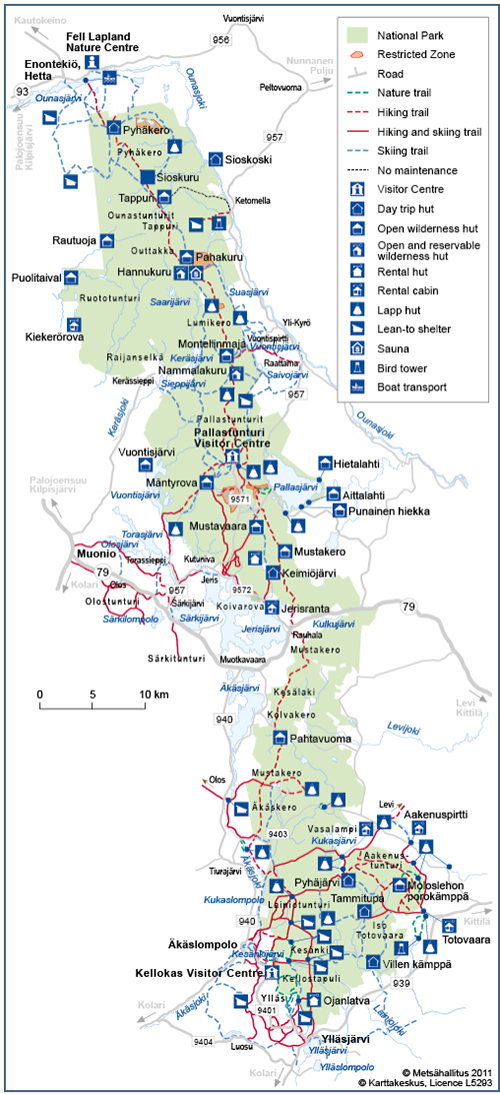 A very popular trail called Velhopolku Trail (Wizard´s Trail) begins at Kellokas Visitor Centre. The trail is 4-km-long and leads through Varkaankuru Ravine. At Kellokas visitors can also get onto Kiirunan kieppi Trail (12 km), which circles Keskisenlaki Fell in Ylläs, and Seitapolku Trail (9 km). There is a 1-km-long winter trail in the area. A 17-km-long trekking nature trail at Aakenustunturi Fell has exhibits on the area’s animals, geology and history. Joutsenpolku Trail (6 km) at Latvajärvi displays the area’s birds, mammals and fish.A 1-km-nature trail with information on volcanoes can be found next to the road running between Äkäslompolo and Kittilä.