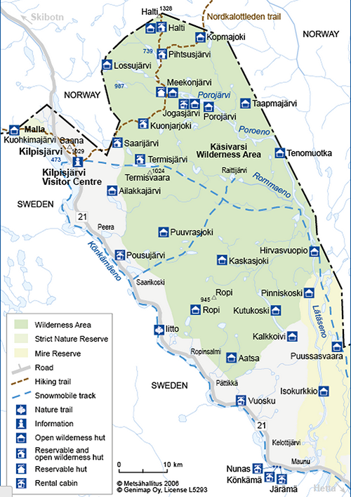 Metsähallitus has 8 open and 6 reservable wilderness huts on Nordkalottleden Trail. The open wilderness huts at Lake Saarijärvi, the River Kuonjarjoki, Lake Pihtsusjärvi and Halti Fell are located in the same building as the reservable wilderness hut there. The open and reservable wilderness huts at Lake Meekonjärvi are about a half kilometre from each other. Kopmajoki open wilderness hut is situated near the Norwegian border.