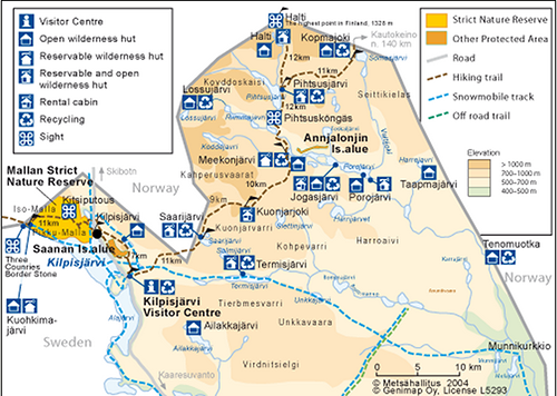 In Finland, as well as crossing the Malla Strict Nature reserve, the Nordkalottleden Trail leads through Käsivarsi Wilderness Area. Everyman’s rights are in effect in the wilderness area.