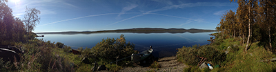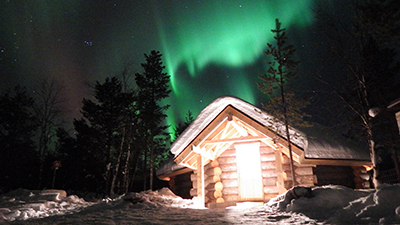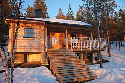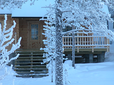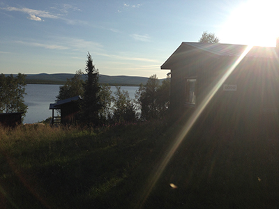 We have two small cabins side by side on an ox-bow of the Palojöki river. The smaller cabin is used primarily by guides in winter, and the larger one by overnight client groups. The small cabin sleeps 3 people and the larger cabin, 8. There is also a wilderness sauna, a wilderness toilet and a log shed. These cabins are located approximately mid-way between Leppajärvi and Palojoensu and therefore provide a great overnight location for paddlers.